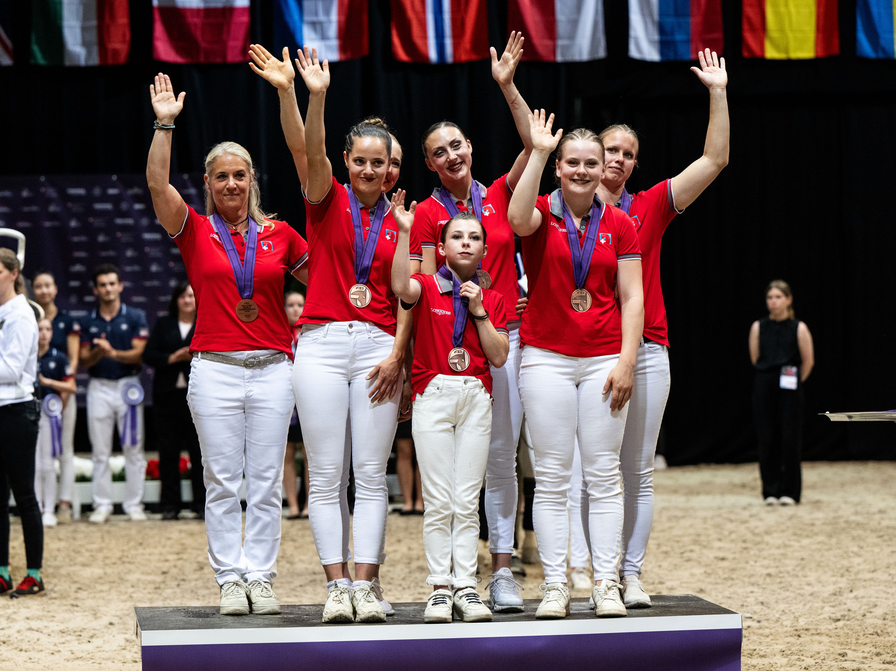 En clôture de cinq jours de sport et de spectacle, l’épreuve « Prix des Nations » des Mondiaux de voltige s’est déroulée ce dimanche après-midi à la PostFinance Arena de Berne. Au terme de trois excellents programme (8,790), la Suisse s’est parée de bronze grâce à Ilona Hannich (Rayo de la Luze), qui tenait sa revanche sur l’individuel et le Pas-de-Deux, Lukas Heppler (Enjoy the Moment) et au Team Lütisburg (Acardi van de Kapel), déjà médaillé vendredi. L’Allemagne a décroché l’argent (8,923) tandis que la France, intouchable avec 9,239 pts, était en or.