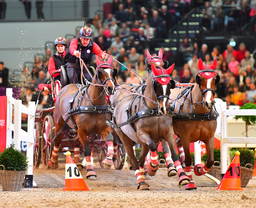 La Coupe du monde d’attelage clôturait cette édition du concours de Malines. Malgré l’heure tardive (premier son de cloche à 22h !), le public est resté en nombre dans les gradins pour saluer les performances des six meneurs engagés. Vainqueur hier, Jérôme Voutaz a cette fois-ci dû s’incliner face à Bram Chardon. Dernier à s’élancer au barrage, le Hollandais, lauréat de la dernière finale, a mis tout le monde d’accord en s’imposant avec une faute, mais huit secondes d’avance sur le Valaisan qui a commis deux erreurs avec des FM toujours aussi volontaires et agiles. À cette occasion, le meneur de Sembrancher, déjà excellent à Stuttgart (2e), était accompagné sur le char de Nicole Basieux et Philippe Jeanneret. Il misait sur un quatuor composé de Belle du Peupe CH, Flower de Gessenay, Leon et Lune de la Vieille Fontaine.