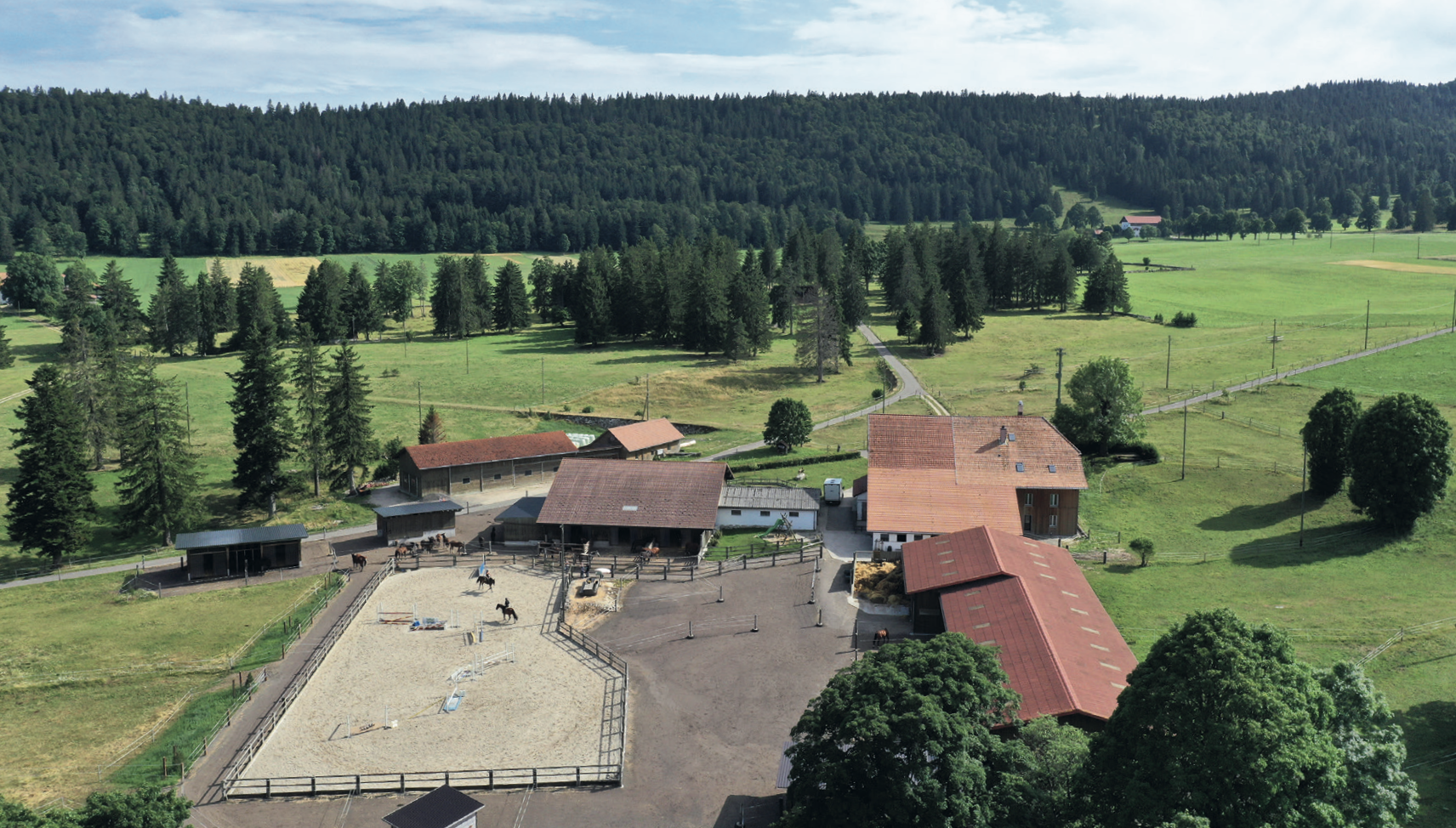L'arrivée à l'élevage des Prés se fait au terme d'une route de montagne sinueuse depuis Cortébert. La bâtisse est située à plus de mille mètres d’altitude, en bordure de trente-deux hectares appartenant à la famille Ledermann-Schaller. On est accueilli joyeusement par les chiens, alors que deux chats nous scrutent depuis l’écurie. L’ambiance est paisible en ce samedi de février. C’est Chantal Schaller, solaire et dynamique, qui nous fera la visite des lieux, nous guidant d’étable en étable, aujourd’hui toutes transformées en écuries.