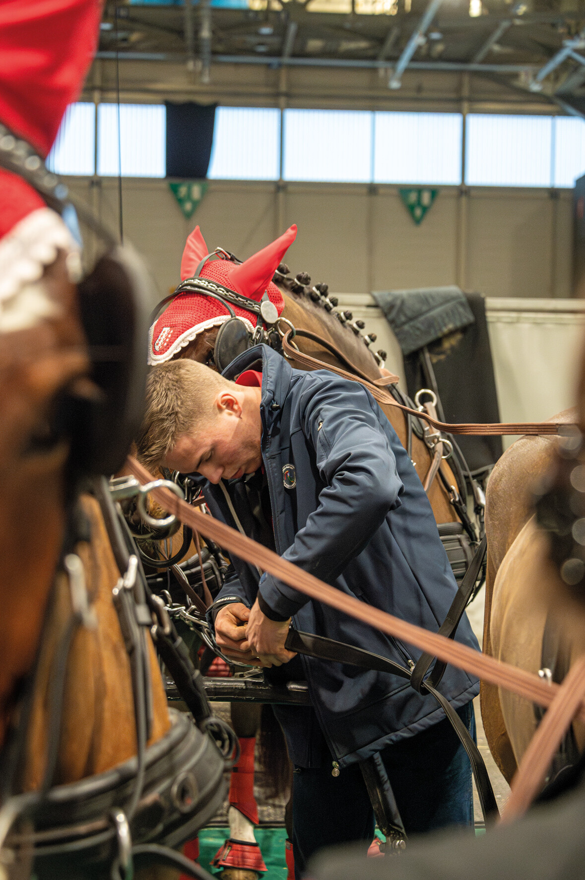 Seize cloches, autant de guêtres, cinq brides — dont une de secours — et quatre harnais, tous soigneusement étiquetés au nom de chaque cheval. Cet arsenal parfaitement ordonné tient dans une sellerie sur roues faite maison, pensée pour tout contenir. Autour, les grooms s’activent sans relâche, vont et viennent entre les boxes. À un peu plus d’une heure de l'épreuve d'ouverture de la Coupe du monde d’attelage du CHI de Genève, les écuries ressemblent à une ruche en pleine effervescence : Andy nettoie les cuirs, Léo démêle la queue de Flower, Martine trie les lots de guêtres. « Tous les grooms s’occupent de tous les chevaux », explique Jérôme, avant d’être coupé par Walter Zwald, doyen de l’équipe : « Sauf moi ! Je m’occupe uniquement de Léon, le plus vieux cheval, il a 15 ans. On s’entend bien entre retraités ! »