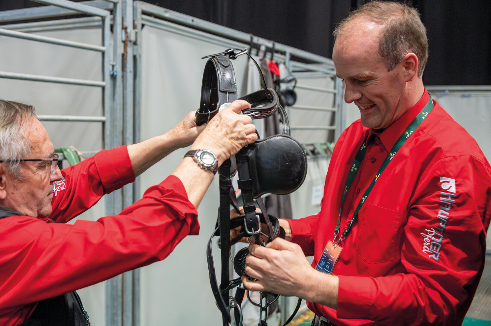 Walter aide Jérôme pour l'ajustement des mors et des gourmettes, avant de brider les chevaux. © Julie Queloz