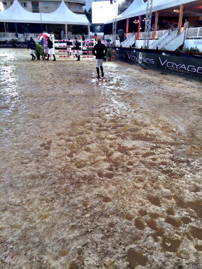 Cannes accueillait la 5e étape du Global Champions Tour 2014 ce samedi 14 juin. Les organisateurs ont dû faire face à une pluie battante avant ce Grand Prix. Même si le terrain a souffert (voir photo ci-dessous) et que 13 concurrents ont abandonné en cours d'épreuve, le podium avait fière allure.